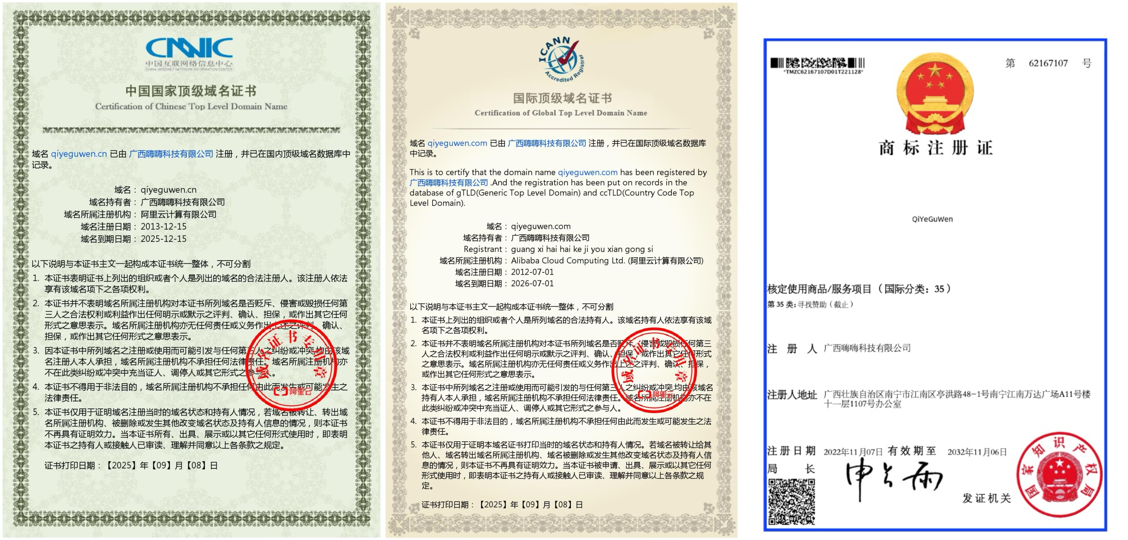 企业顾问网,认准全球唯一的企业顾问官方网站域名:qiyeguwen.com和qiyeguwen.cn;并获得国家知识产权局颁发的商标证书,以及国家版权局颁发的版权证书。
